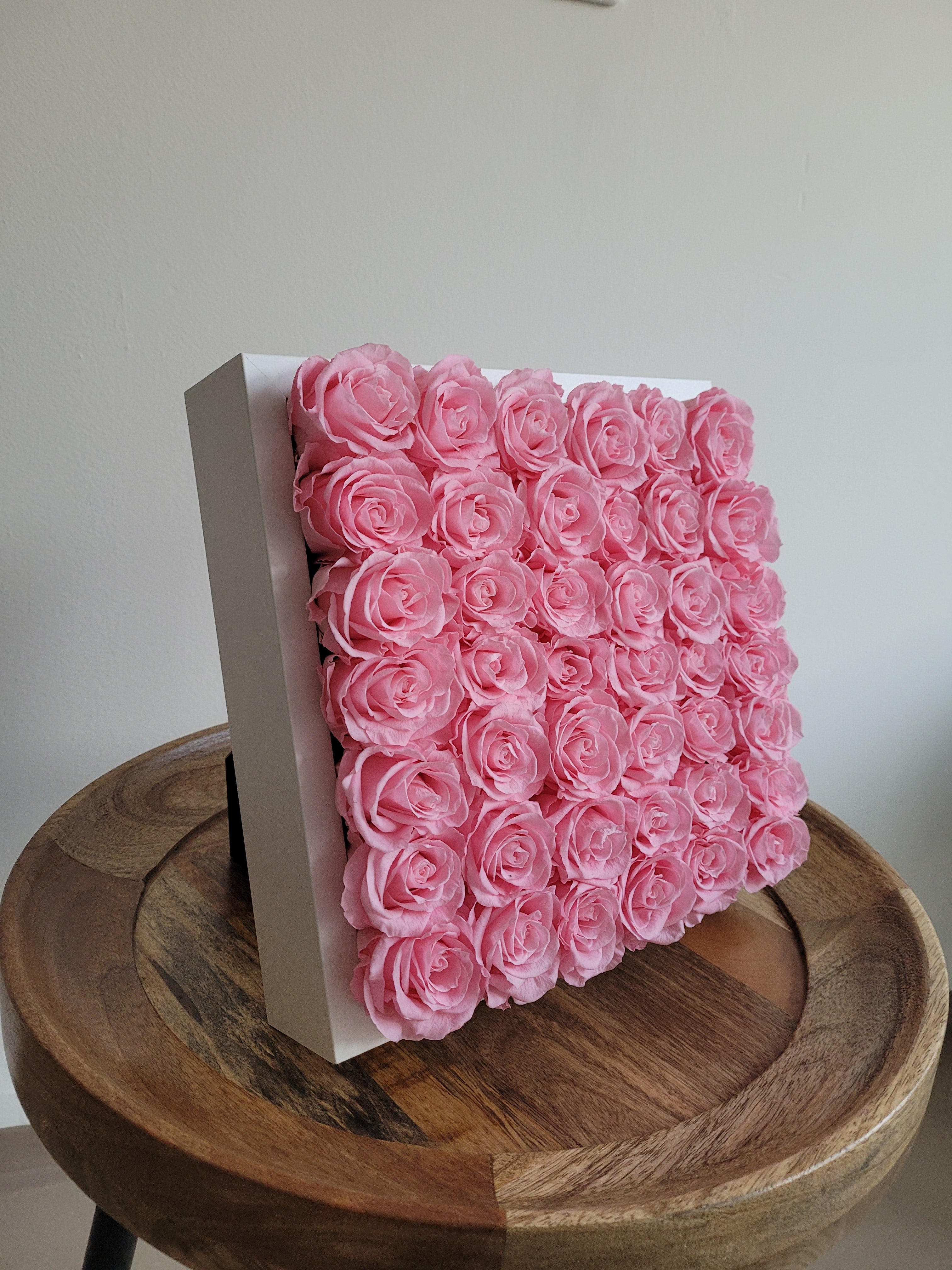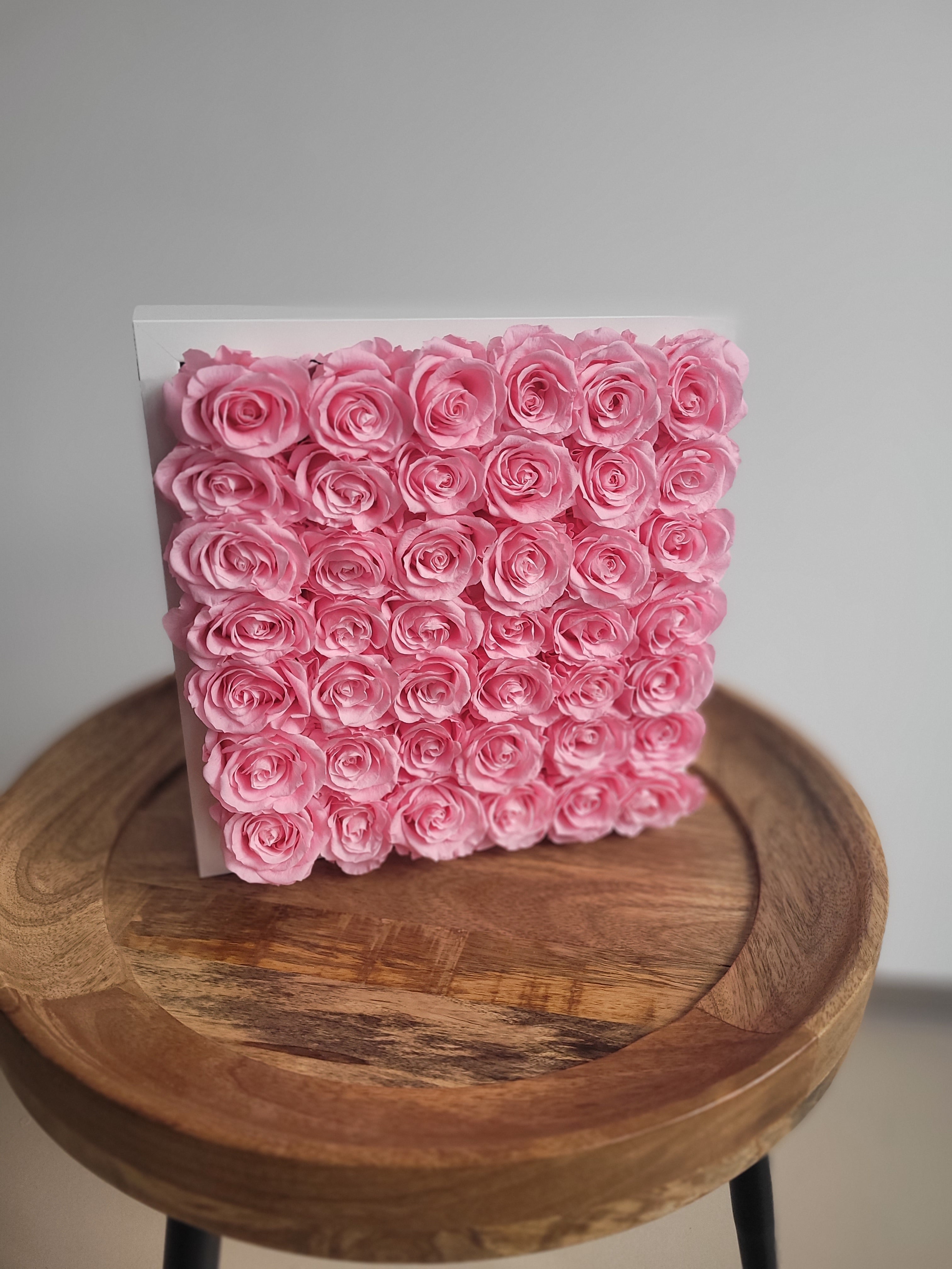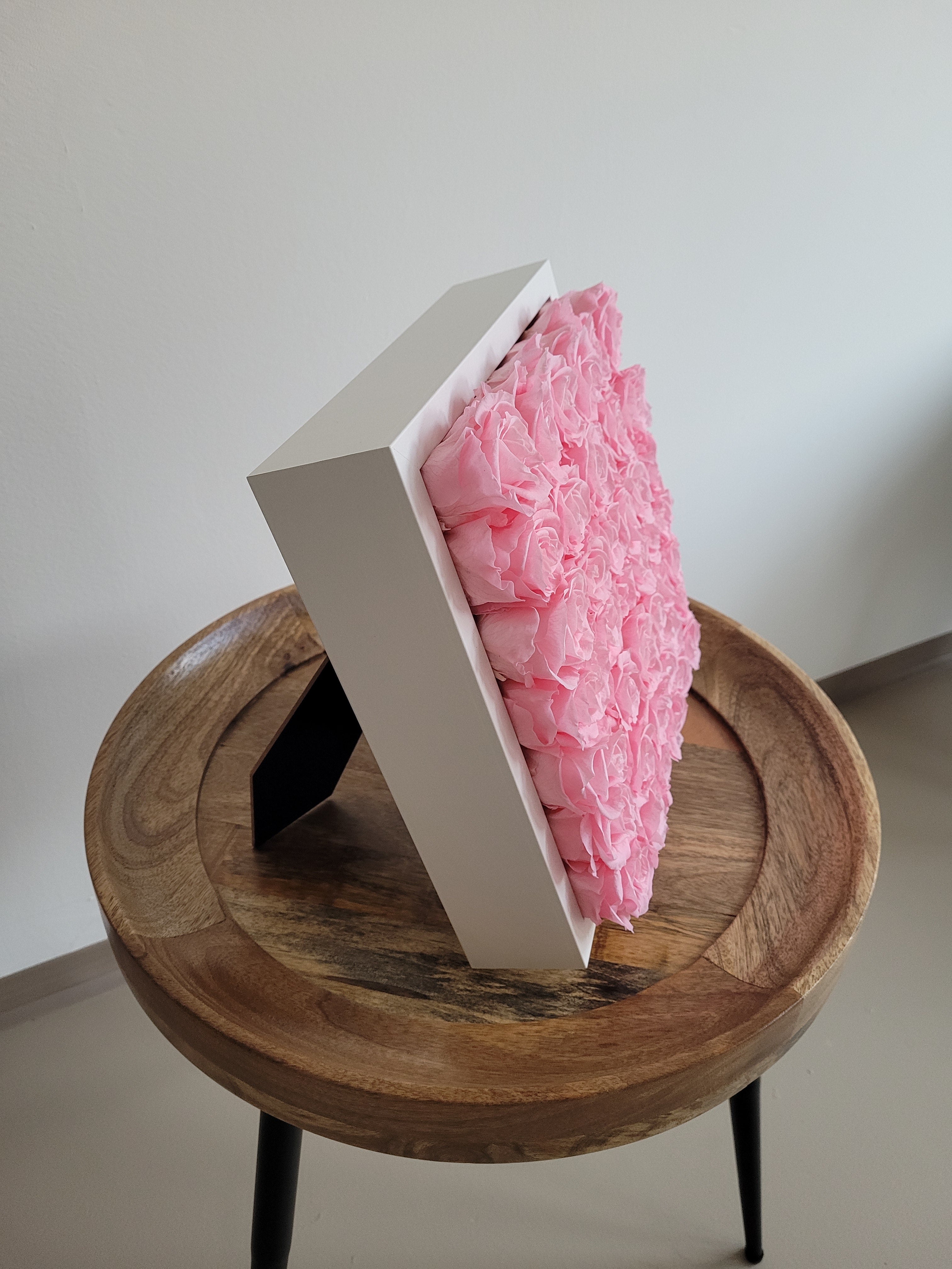 Ein wunderschöner Rosenbilderrahmen in schlichtem weiß entweder zum Aufstellen, Hinlegen oder zum Aufhängen an die Wand. Jede einzelne Rose wird für Dich liebevoll von Hand gesteckt. Insgesamt versüßen Dir 32 (20x20cm) bzw. 42 (25x25cm) Rosen dein Ambiente und verleihen Deinem Raum einen angenehmen und frischen Duft. Wie auch bei unseren anderen Produkten, handelt es sich hierbei um unsere Infinity Rosen woran du Dich bis zu 3 Jahren erfreuen kannst.